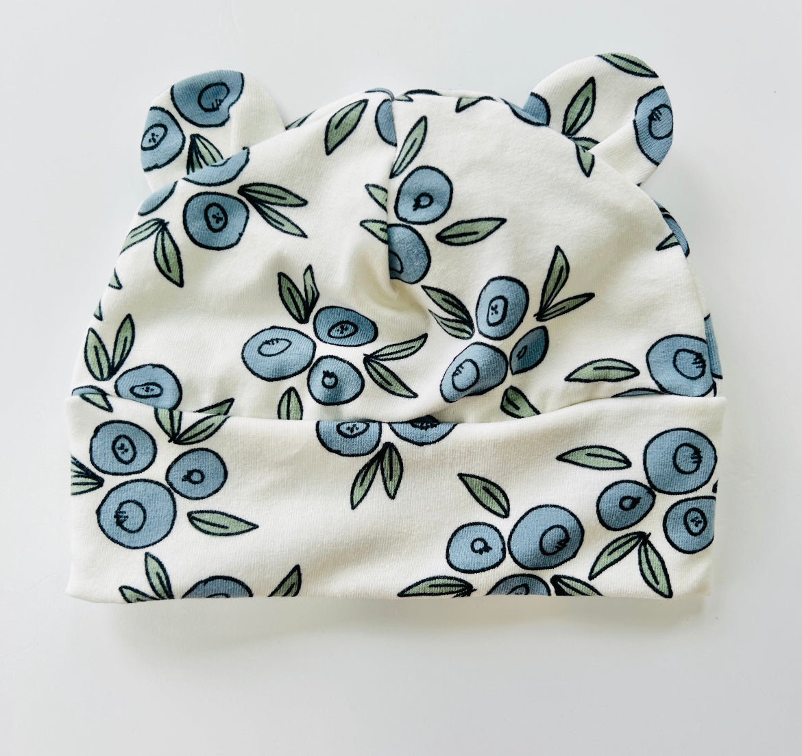 Eddie & Bee organic cotton Baby hat with ears in Cream " Blueberry" print.