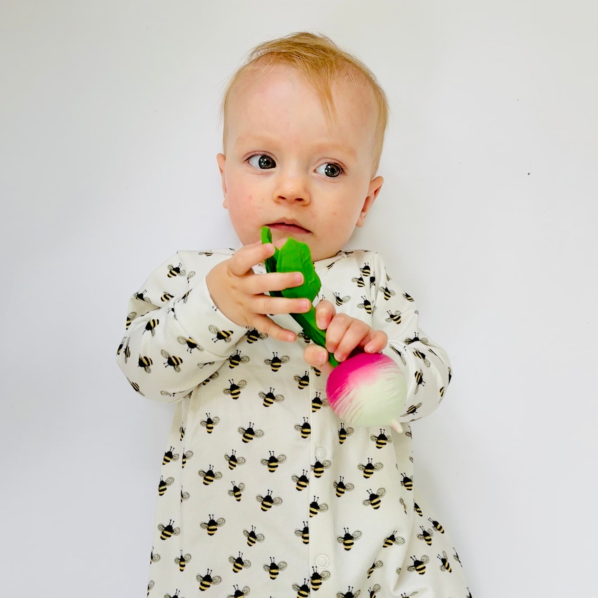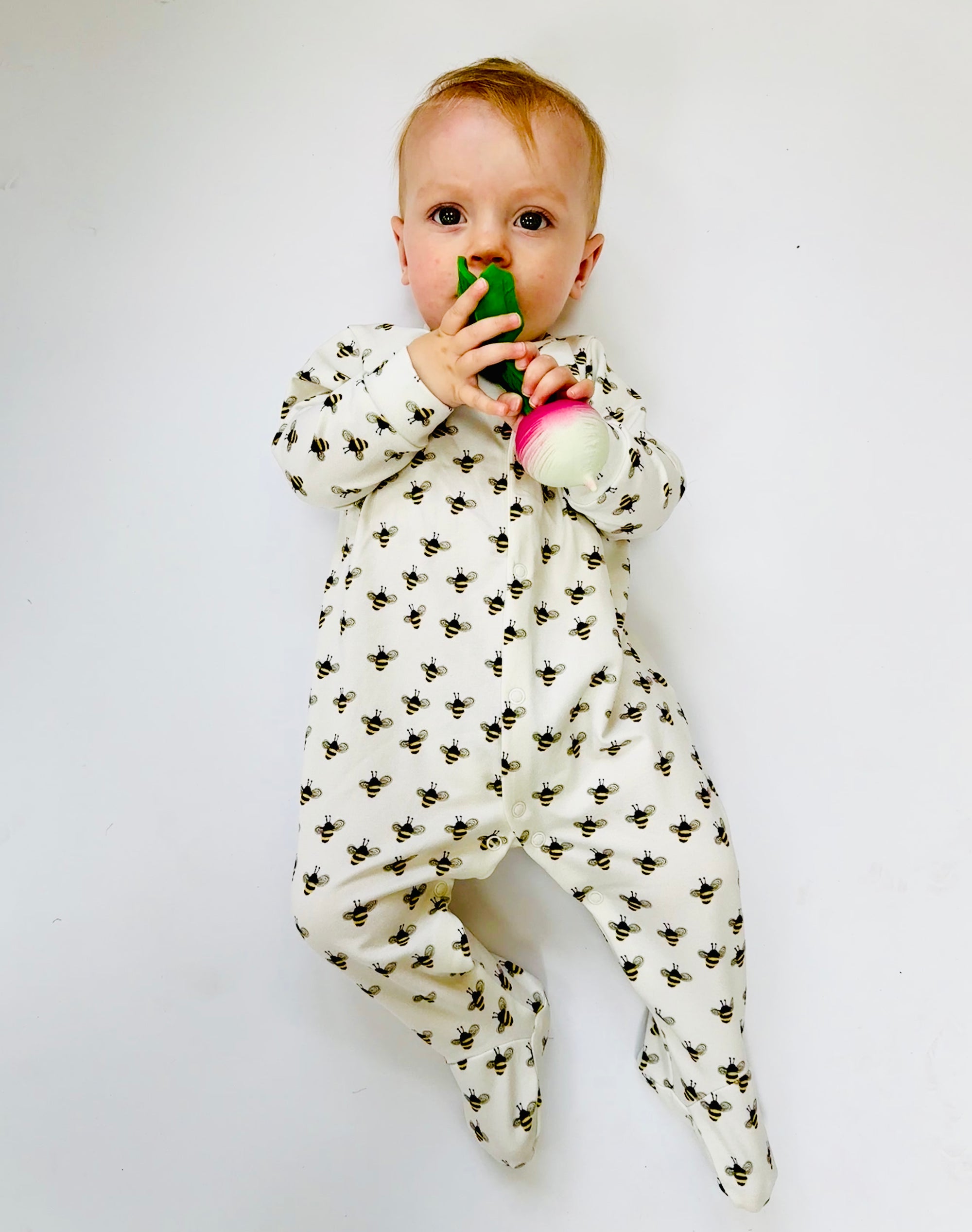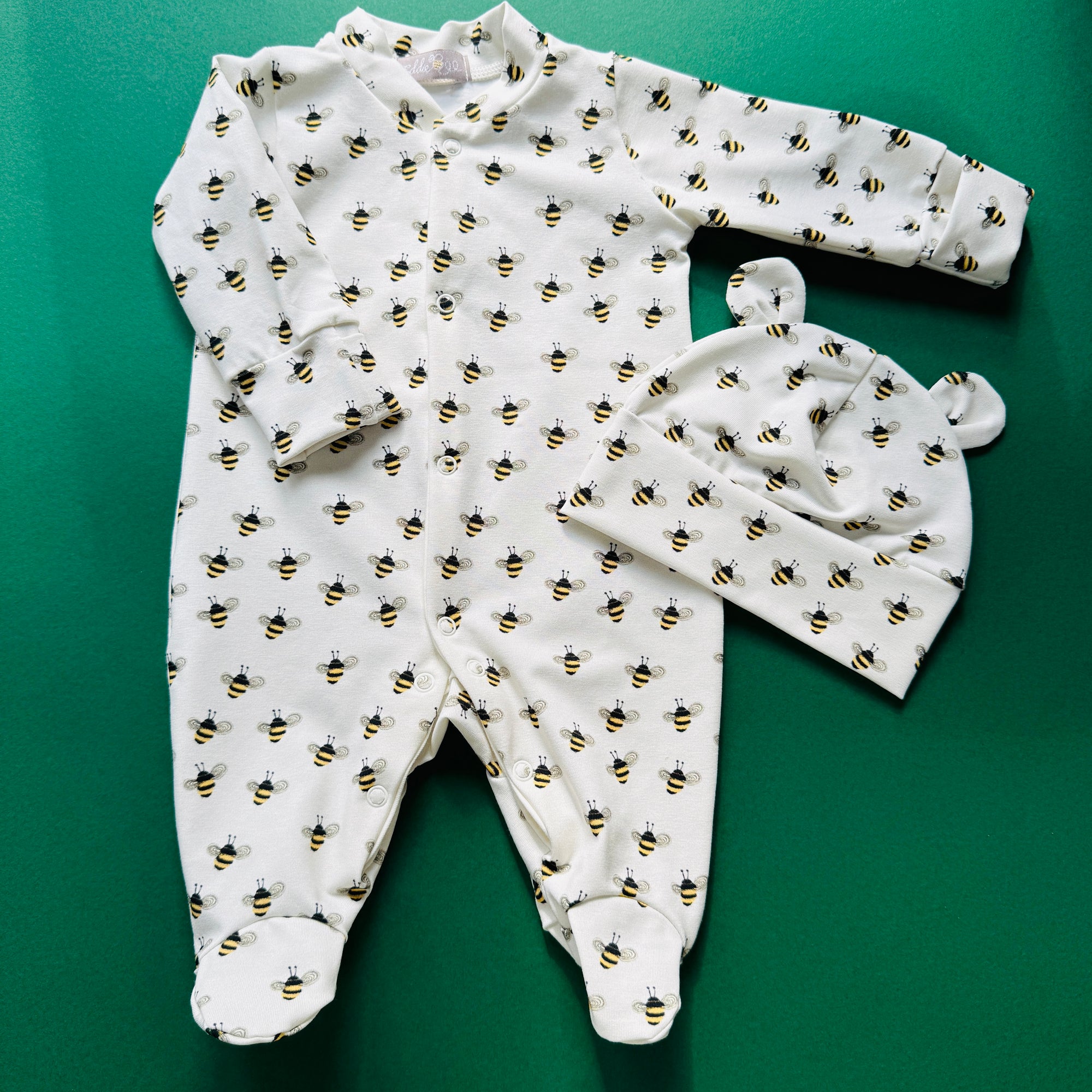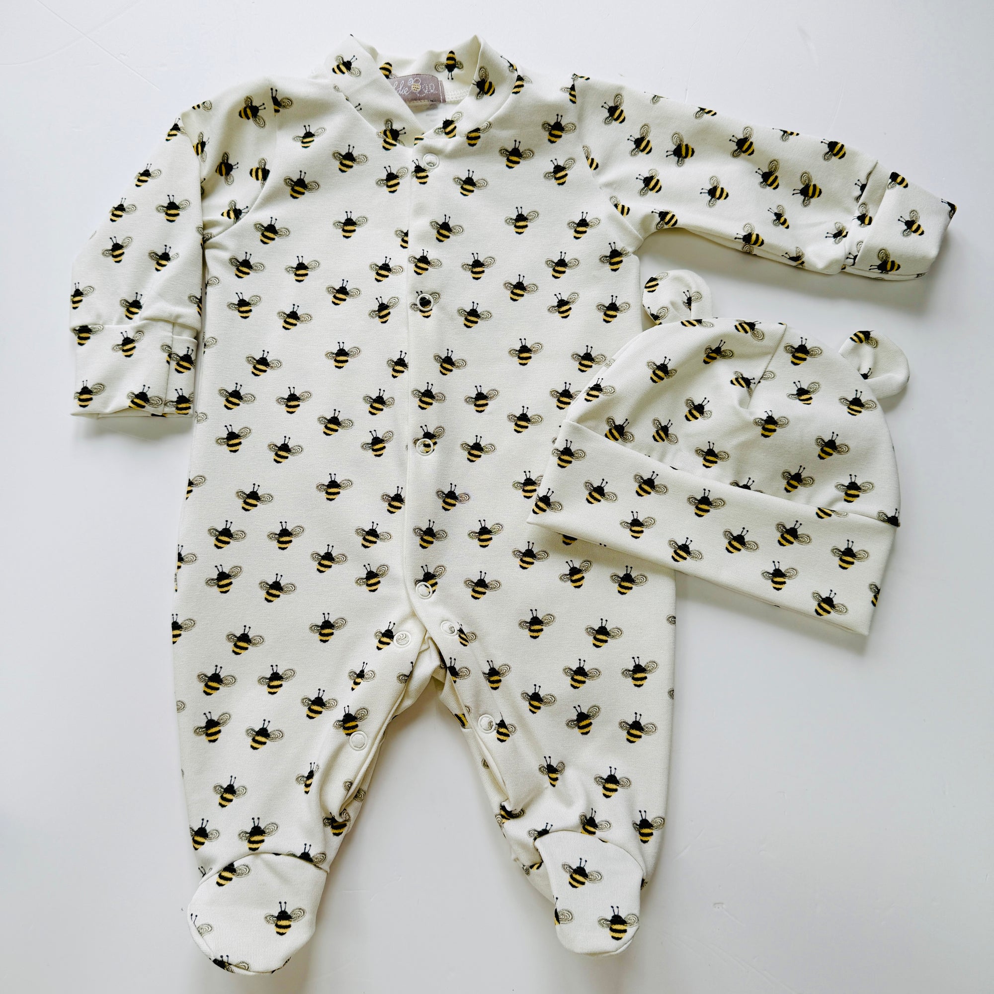 Eddie & Bee organic cotton Baby sleepsuit in Cream " Bees " print.