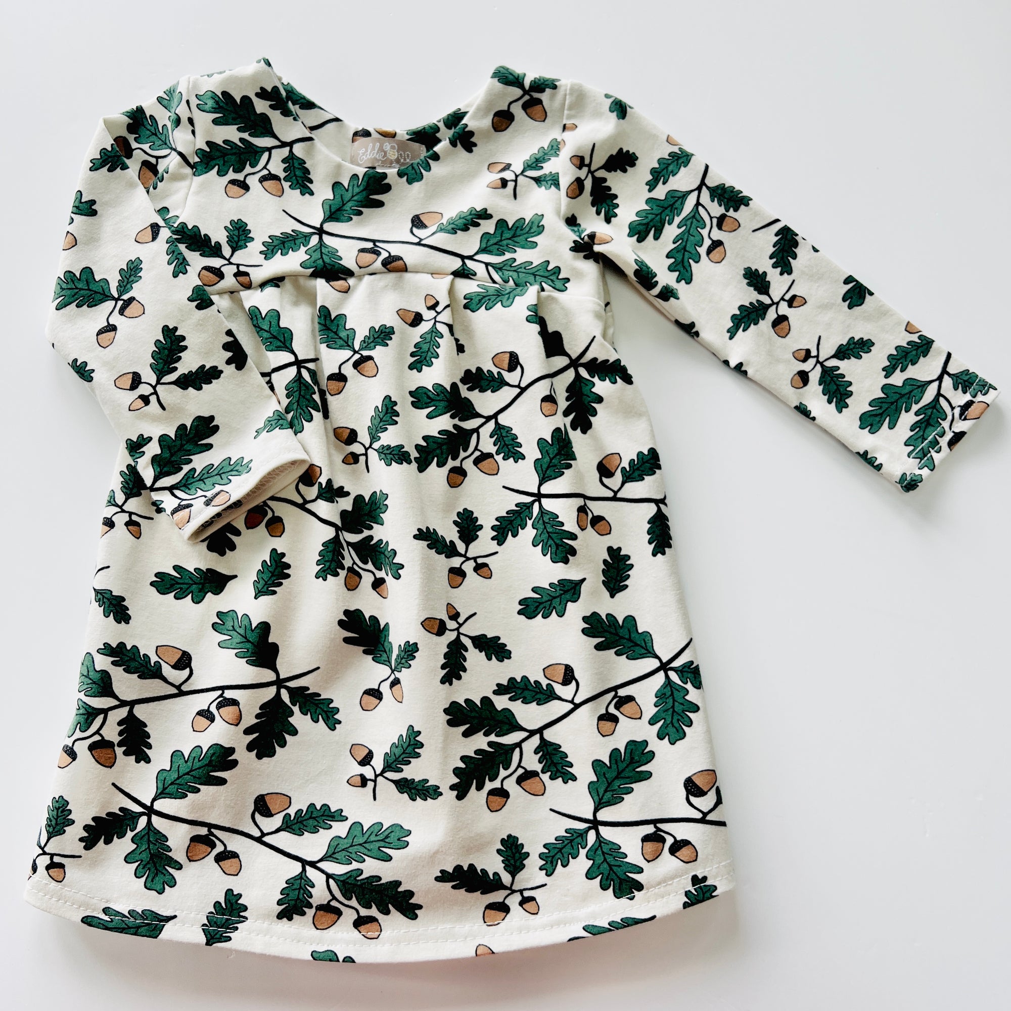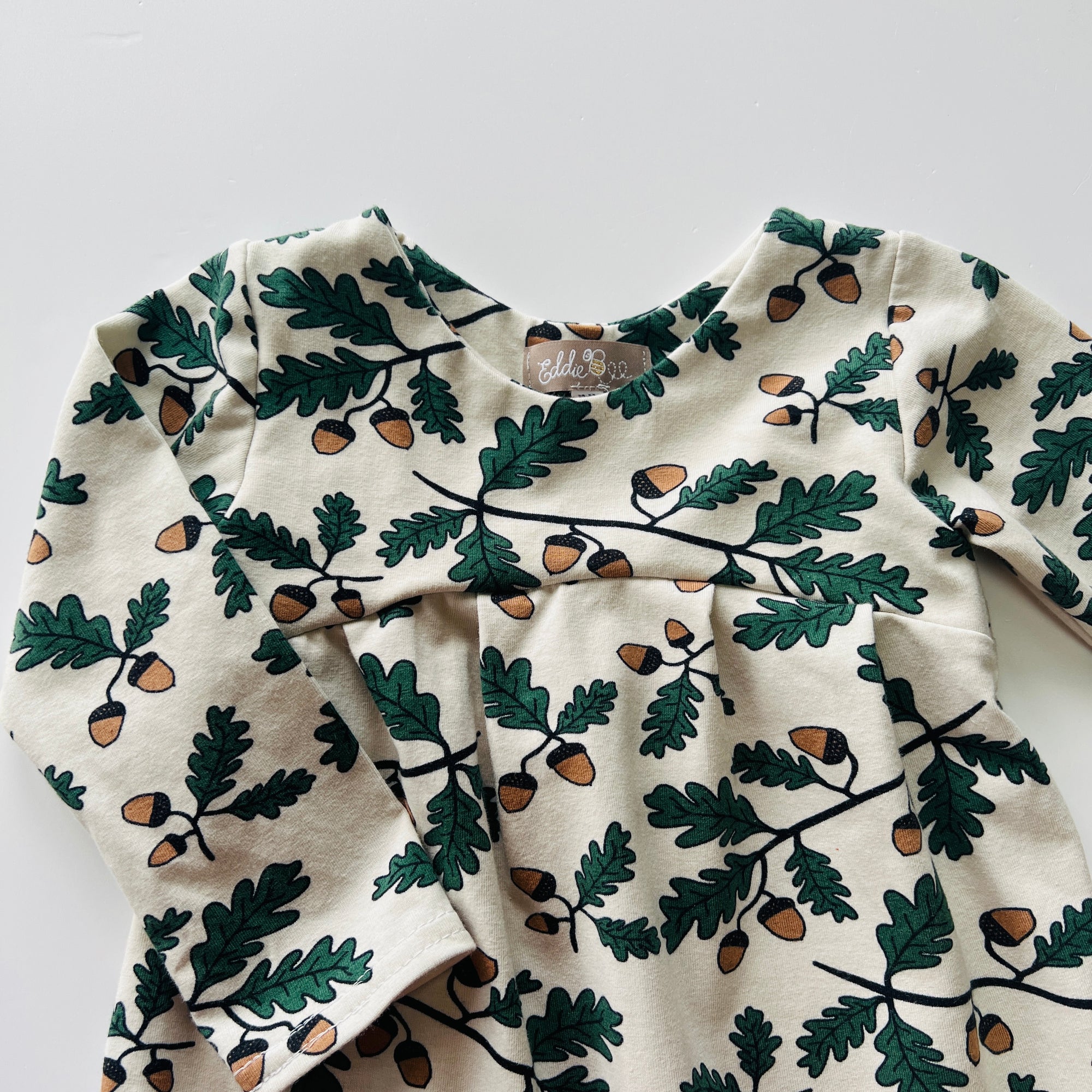 Eddie & Bee organic cotton long sleeved dress in Oat “Little Acorns” print
