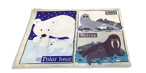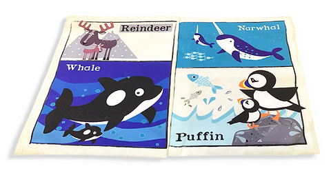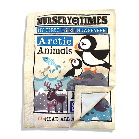 Nursery Times Crinkly Newspaper. Arctic Animals. Simply cute illustrations of animals with their young. Dimensions approx: 30cm x 20cm. CE tested and machine washable. A practical, lightweight cloth book with crinkly pages. A great sensory toy. A unique gift. Packed in a card pop box.