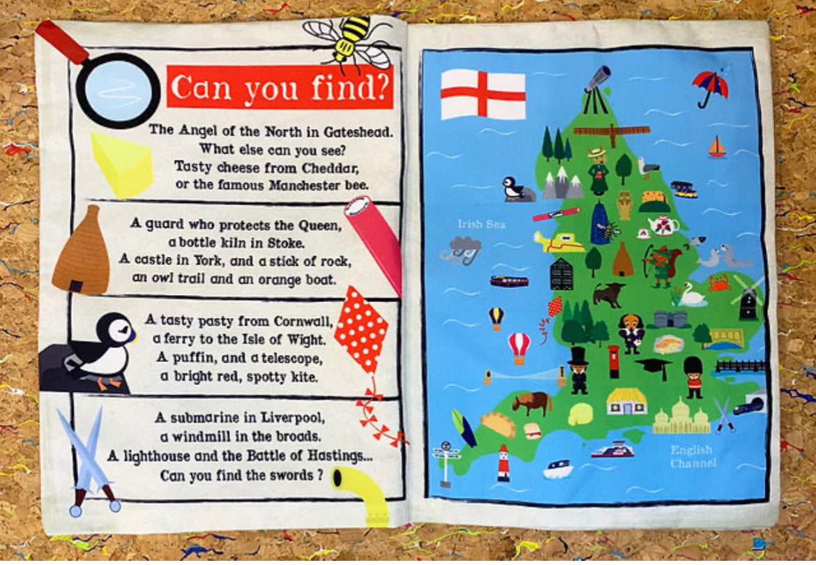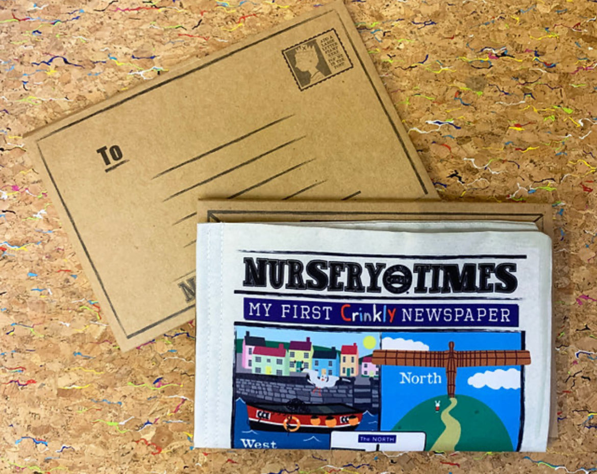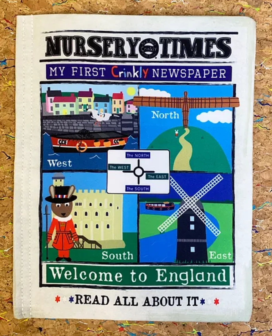 Nursery Times Crinkly Newspaper. Welcome To England. 6 pages of cute and fun illustrations, with simple names of places exploring England and a full page rhyme. Dimensions approx: 30cm x 20cm. CE tested and machine washable. A practical, lightweight cloth book with crinkly pages. A great sensory toy. A unique gift. Each newspaper is packed in a gifting envelope to add 'To' and 'From' and a short message.