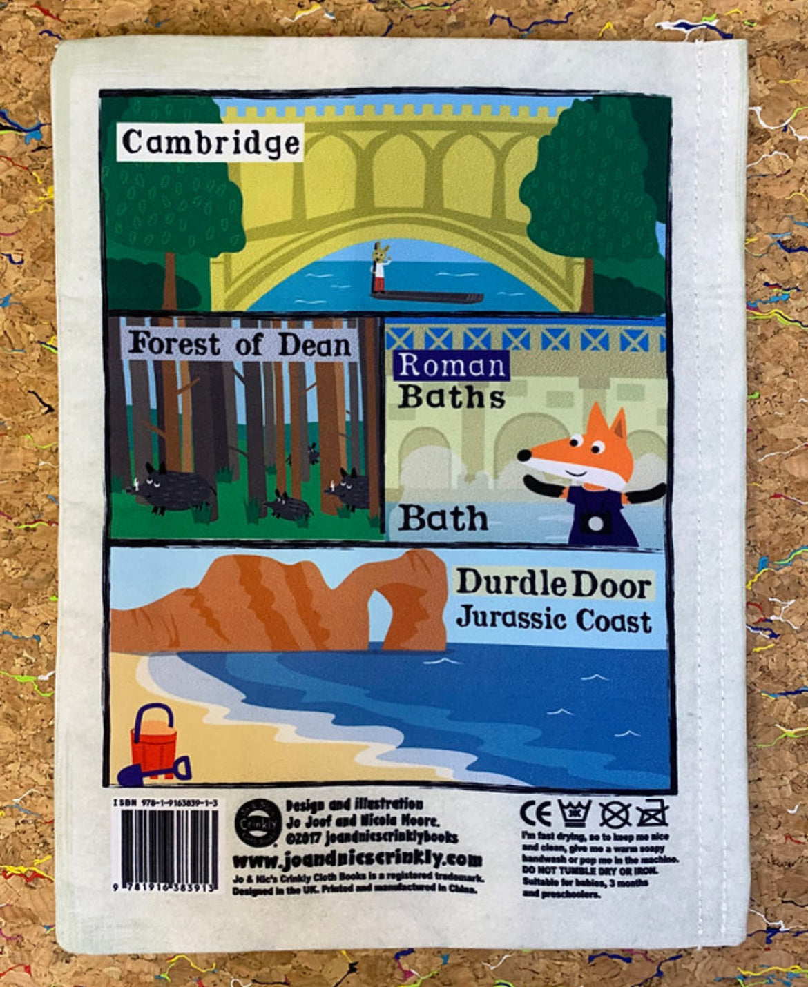 A cute cloth book for babies with crinkly filled pages. 30cm x 25cm approximately. Machine washable and handmade using safety tested materials.