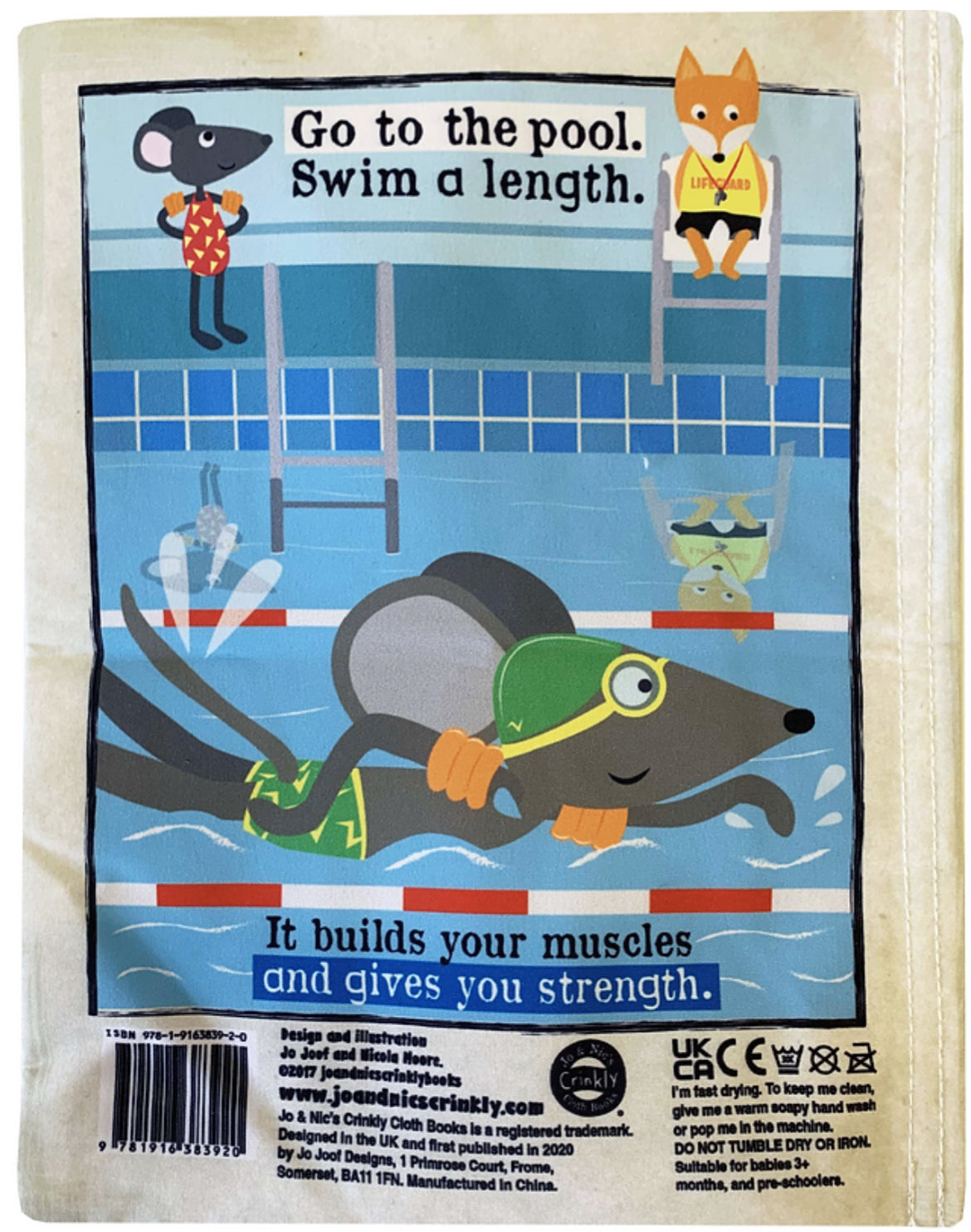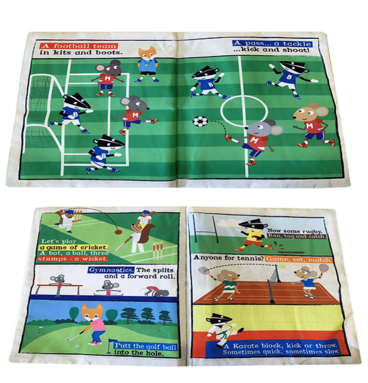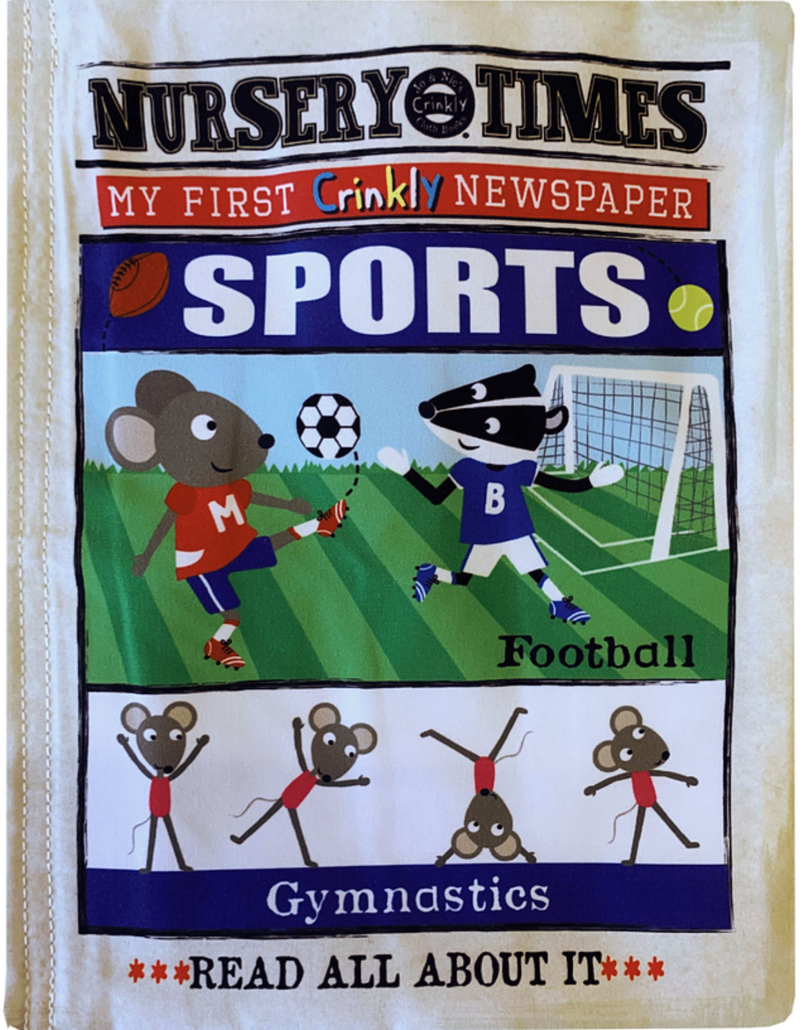 Nursery Times Crinkly Newspaper. Let's Play sports. 6 pages of cute and fun illustrations about various sports activities with rhyming text. Encouraging children to take part in activities. Dimensions approx: 30cm x 20cm. CE tested and machine washable. A practical, lightweight cloth book with crinkly pages. A great sensory toy. A unique gift. Each newspaper is packed in a gifting envelope to add 'To' and 'From' and a short message.
