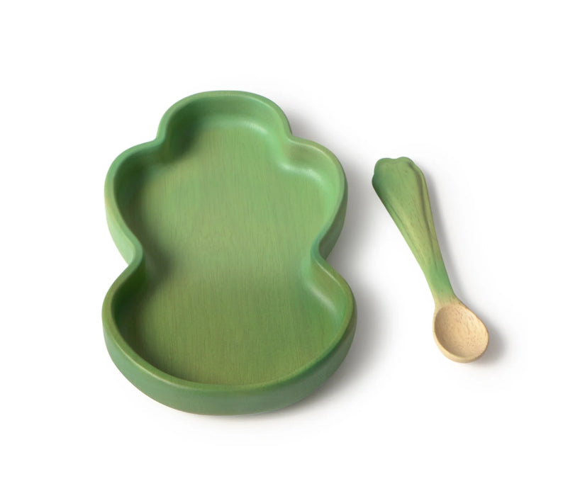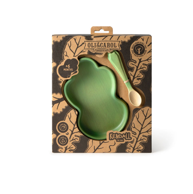 Looking for high-quality plastic-free baby plates and weaning spoons? The Oli & Carol Wooden Baby Plate and Spoon Set guarantees safety from the first bite, and comes in a range of fun fruit and veg designs! This two-piece set features a Kendall the Kale baby plate with a beautiful hand painted design, and a matching weaning spoon finished with non-toxic paints.