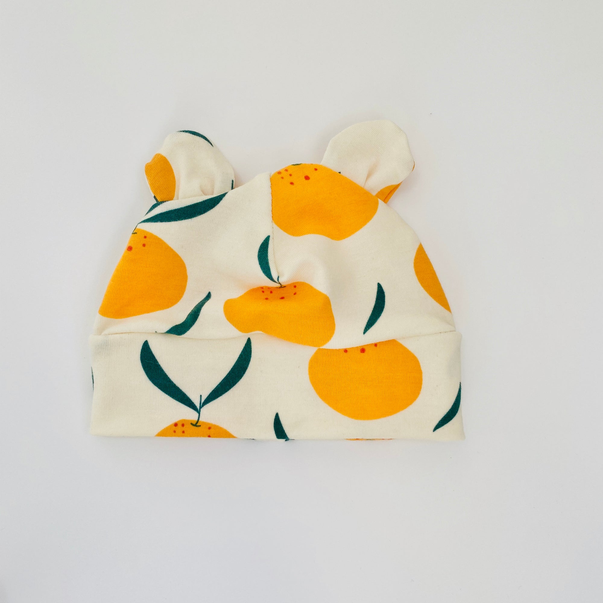Super soft organic cotton Baby hat with ears in Cream " Clementine Grove" print.