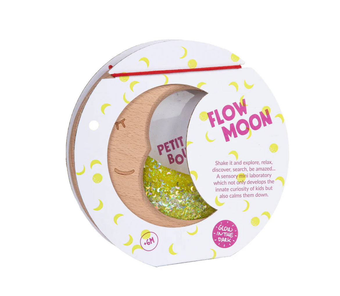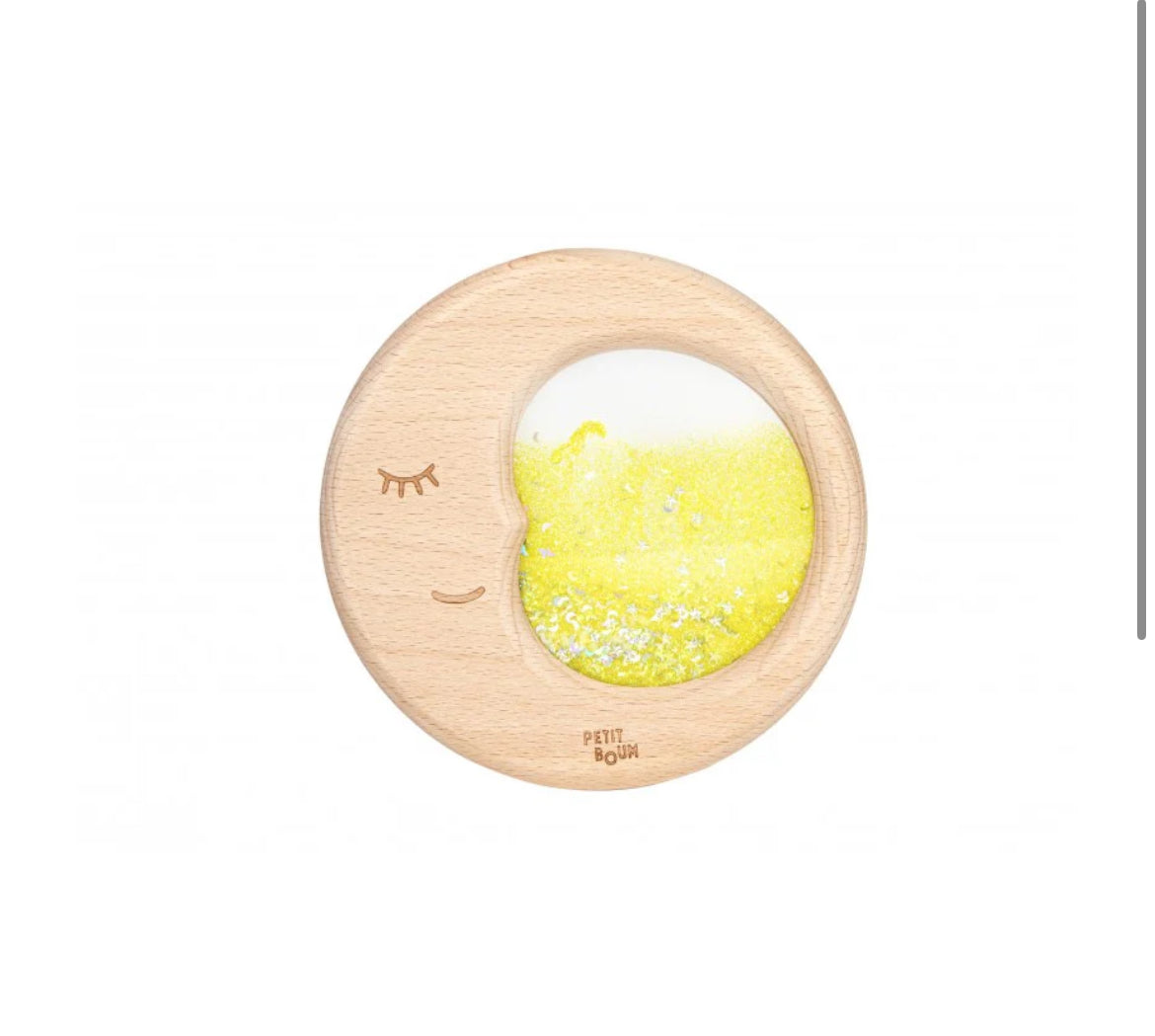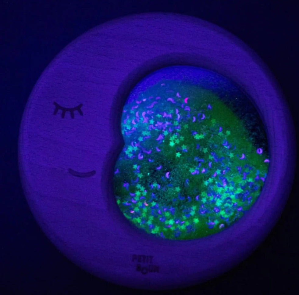 All the magic of our bottles, now in the shape of a moon, with a beech wood frame ideal for the hands of the little ones. This moon is filled with coloured liquids, glitter and fluorescent fluids that glow in the dark and stimulate your imagination every time you shake them. All it takes is one movement for them to marvel at their starbursts and the effects that light creates when passing through them!