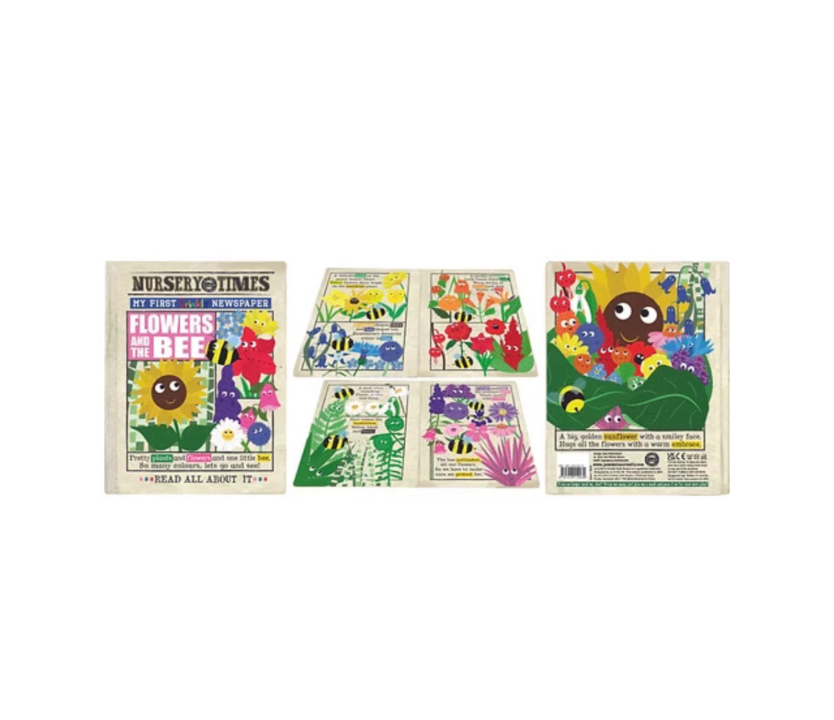 Nursery Times Crinkly Newspaper. Flowers and the bee. Rhyming text about different groups of flowers, descriptions and colours. The importance of flowers for the bee. Dimensions approx: 30cm x 20cm. CE tested and machine washable. A practical, lightweight cloth book with crinkly pages. A great sensory toy. Each newspaper is packed in a gifting envelope to add 'To' and 'From' and a short message.